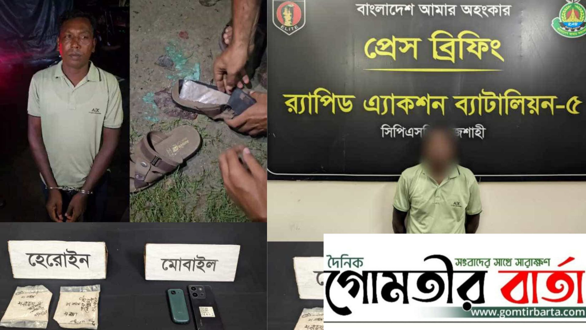 • রাজশাহীতে জুতার ভিতরে হেরোইন পাচারকালে ১ জনকে গ্রেফতার করেছে র‍্যাব-৫