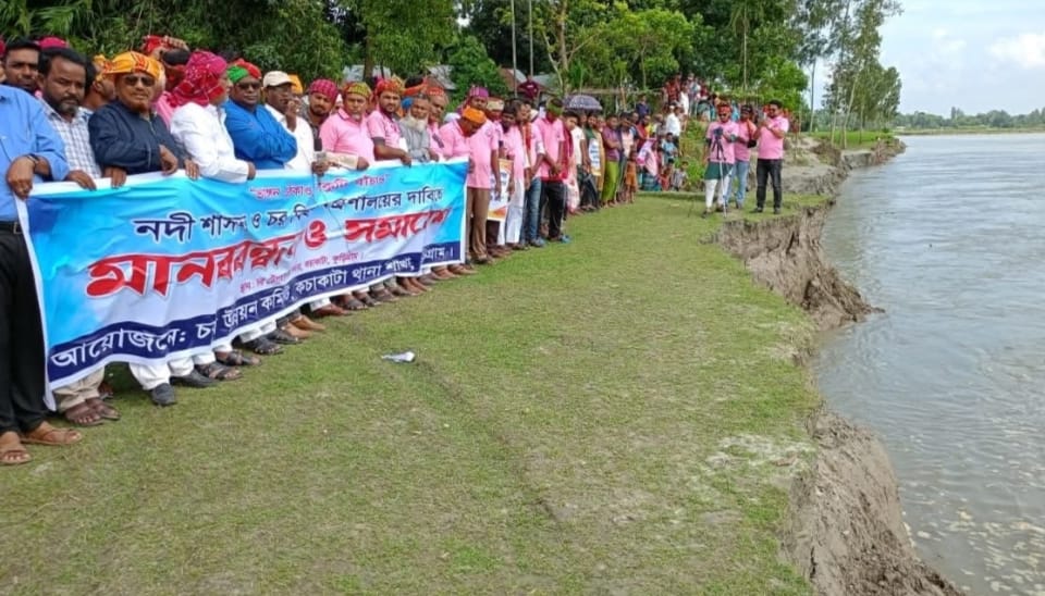 নদীভাঙনের রোষ থেকে মুক্তি ও স্থায়ী সমাধান চায় চর ও নদীভাঙন কবলিত মানুষ। ‘পার্বত্য বিষয়ক মন্ত্রণালয়’-এর মতো আলাদা ‘চর বিষয়ক মন্ত্রণালয়’ গঠনের দাবিতে শনিবার দুপুরে কুড়িগ্রামের নাগেশ্বরী উপজেলার কচাকাটা এলাকায় অনুষ্ঠিত হয়েছে মানববন্ধন ও সমাবেশ।