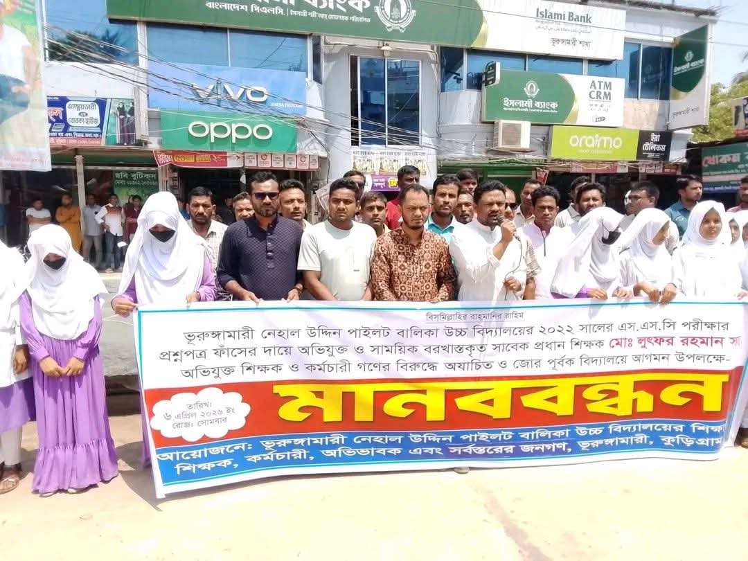 কুড়িগ্রামের ভূরুঙ্গামারী উপজেলায় নেহাল উদ্দিন বালিকা পাইলট উচ্চ বিদ্যালয়ের ২০২২ সালের এসএসসি প্রশ্নপত্র ফাঁসের ঘটনায় অভিযুক্ত ও সাময়িক বরখাস্তকৃত প্রধান শিক্ষকসহ সংশ্লিষ্টদের পুনর্বহাল চেষ্টাকে কেন্দ্র করে এলাকায় চরম উত্তেজনা বিরাজ করছে। এ ঘটনায় সোমবার সকালে শিক্ষার্থী, শিক্ষক, অভিভাবক ও স্থানীয় জনগণের উদ্যোগে মানববন্ধন ও বিক্ষোভ কর্মসূচি পালিত হয়েছে।