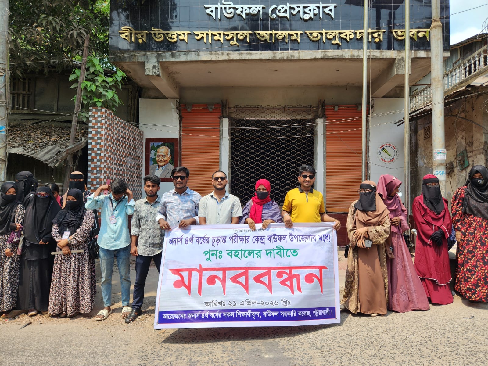 পটুয়াখালীর বাউফল উপজেলায় অনার্স ৪র্থ বর্ষের চূড়ান্ত পরীক্ষার কেন্দ্র হঠাৎ পটুয়াখালীতে স্থানান্তরের প্রতিবাদে মানববন্ধন করেছেন বাউফল সরকারি কলেজ-এর শিক্ষার্থীরা। মঙ্গলবার (২১ এপ্রিল ২০২৬) সকালে কলেজ প্রাঙ্গণ থেকে শুরু হওয়া এ কর্মসূচি প্রধান সড়ক প্রদক্ষিণ শেষে বাউফল প্রেসক্লাব-এর সামনে গিয়ে শেষ হয়।