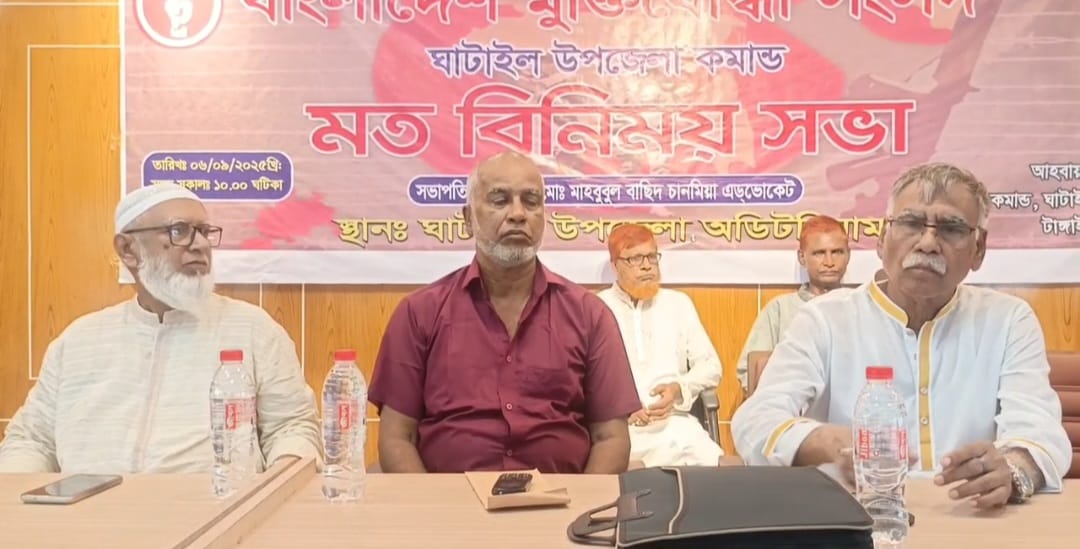 টাঙ্গাইলের ঘাটাইলে বাংলাদেশ মুক্তিযোদ্ধা সংসদ, ঘাটাইল উপজেলা কমান্ডের মত বিনিময় সভা অনুষ্ঠিত হয়েছে। ৬ সেপ্টেম্বর শনিবার সকাল ১১টায় ঘাটাইল উপজেলা হলরুমে কুরআন তেলোয়াতের মাধ্যমে সভাটি শুরু হয়। এডভোকেট মোঃ মাহবুবুল বাছিদ চানমিয়ার সভাপতিত্বে সভায় প্রধান অতিথি হিসেবে উপস্থিত ছিলেন জেলা মুক্তিযোদ্ধা কমান্ডের আহবায়ক এডভোকেট আব্দুল খালেক মন্ডল। বিশেষ অতিথি হিসাবে বক্তব্য রাখেন ঘাটাইল উপজেলা সহকারি কমিশনার (ভূমি) মোঃ জাহিদুর রহমান,এ সময় বীরমুক্তিযোদ্ধা ফজলুল হক, বীরমুক্তিযোদ্ধা শামছুল হক, নবগঠিত ঘাটাইল উপজেলা কমান্ডের সদস্য সচিব এন এম শাহনেওয়াজ, বীরমুক্তিযোদ্ধা শাহাদত হোসেন, বীরমুক্তিযোদ্ধা হাবিবুর রহমান, বীরমুক্তিযোদ্ধা আঃ ছাত্তার, জিবিজি কলেজের সাবেক অধ্যক্ষ বীরমুক্তিযোদ্ধা সামছুল আলম সহ জেলা উপজেলার বীর মুক্তিযোদ্ধারা উপস্থিত ছিলেন।
