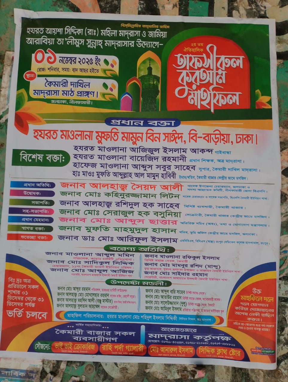 নীলফামারীর জলঢাকা উপজেলার কৈমারী দাখিল মাদ্রাসা মাঠে আগামী ১ নভেম্বর ২০২৫ (শনিবার) বাদ আসর থেকে অনুষ্ঠিতব্য “দ্বিতীয় তাফসীরুল কোরআন মাহফিল” আকস্মিকভাবে স্থগিত হওয়ায় এলাকায় ব্যাপক ক্ষোভ ও চাঞ্চল্যের সৃষ্টি হয়েছে।