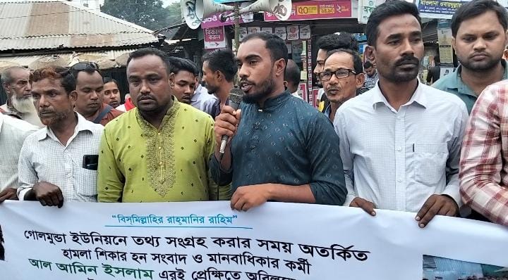 জলঢাকায় সন্ত্রাসী আলম ও রহিম বাহিনীর গ্রেফতারের দাবিতে মানববন্ধন স্থান জলঢাকা জিরো পয়েন্ট মোড় গত ৭ অক্টোবর গোলমুন্ডা ইউনিয়নে তথ্য সংগ্রহ করতে গেলে অতর্কিত হামলার শিকার হন সংবাদ ও মানবাধিকার কর্মী আল-আমিন ইসলাম পরে স্থানীয় সচেতন নাগরিক ও প্রশাসন উদ্ধার করে জলঢাকা স্বাস্থ্য কমপ্লেক্সে ভর্তি করেন সেখানে চিকিৎসাধীন অবস্থায় থাকলে চতুর্থ দিন এসে থানায় একটি এজাহার দায়ের করেন পরে রাতে মামলাটি রেকর্ড করা হয়। আসামি হন ১১ জন নামিও, ও অজ্ঞাত নামা হয় ৮ জন আজকে দীর্ঘ ২২ দিন হয়ে গেলে কোন আসামি গ্রেফতার হয় না। তাই সচেতন নাগরিক ও স্থানীয় সাংবাদিক, মানবাধিকার কর্মীরা এই মানববন্ধন করেন। উক্ত মানববন্ধনে উপস্থিত ছিলেন নীলফামারী জেলার আসকের সভাপতি নির্যাতিত সাংবাদিক আলামিন ইসলাম, সাধারণ সম্পাদক ওমর ফারুক সাবু, সিনিয়র সাধারণ সম্পাদক মোনা ইসলাম, ও বাংলাদেশ মফস্বল সাংবাদিক সোসাইটির সাধারণ সম্পাদক নুরুজ্জামান, রোকনুজ্জামান,সামিনুর রহমান, রিপোর্টাস ক্লাবের সভাপতি এন আই মানিক, শ্যামল চন্দ্র রায়, কামরুজ্জামান, খোকনুজ্জামান খোকন, সহ সাংবাদিক ও মানবাধিকার কর্মীরা আরো উপস্থিত থাকেন। এ সময় বক্তব্যে সংবাদ ও মানবাধিকার কর্মী জামিয়া রহমান বলেন একজন সাংবাদিক প্রশাসনের সামনেই নির্যাতিত হয় এবং মেরে ফেলার উদ্দেশ্যে আক্রমণ করা হয় সেই আসামি গুলো কিভাবে এখনো এলাকায় এলাকায় মিষ্টি বিতরণ করে থানা পুলিশ কি এগুলো চোখে দেখে না আমরা তাই চব্বিশ ঘন্টা আল্টিমেটাম দিলাম যদি আলম ও তার সহযোগীরা গ্রেফতার না হয় আমরা জোরালো আন্দোলন গড়ে তুলবো। আজকের মানববন্ধনের প্রধান সমন্বয়ক সংবাদ ও মানবাধিকার কর্মী আল আমিন ইসলাম বলেন আমাকে যারা হামলা করল আজকে দীর্ঘদিন হয়ে গেল তারা তো গ্রেফতার হলো না বরঞ্চ তারা নাকি আবার জামিন হয়ে এসেছে কি লজ্জার বিষয়। আমি দ্রুত এই মামলার আয়ু সুশান্ত রায় কে প্রত্যাহারের দাবি জানাই কারণ তিনি আসামি ধরতে অক্ষম। এবং আসকের নীলফামারী জেলার সাধারণ সম্পাদক ওমর ফারুক সাবু বলেন আমি এরকম কোন দিন দেখিনি আলামিন ভাই আমাদের সামনেই নির্যাতিত হলো প্রশাসন দাঁড়িয়ে থেকে দেখলো এ পর্যন্ত কোনো ব্যবস্থা নিলো না এর চেয়ে লজ্জার আর কিছু নেই অবিলম্বে সুশান্ত রায় এই মামলার আয়ু তার আমরা প্রত্যাহার চাই। এবং আলম বাহিনীর দ্রুত গ্রেপ্তার দাবি করি। তবে এ বিষয়ে জলঢাকা থানার অফিসার ইনচার্জ যথেষ্ট সাহায্য সহযোগিতা করেছে বলে জানান নির্যাতিত সংবাদ কর্মী আল আমিন ইসলাম। এবং বক্তারা তার বক্তব্য বলেন সংবাদ ও মানবাধিকার কর্মী নাহিদ হাসানকে পরিকল্পিতভাবে সেনাবাহিনীর নির্যাতনের ঘটনায় তাকে ১৫ নাম্বার আসামি করা হয় নাহিদকে এই জায়গায় জড়িত করে তারাও প্রমাণ করে দি
