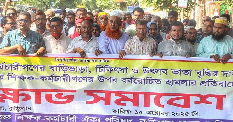 তারা অবিলম্বে ভাতা বৃদ্ধির দাবি মেনে নেওয়ার জন্য সরকারের প্রতি আহ্বান জানান। এছাড়াও ঢাকায় আন্দোলনরত শিক্ষক-কর্মচারীদের ওপর বর্বরোচিত হামলার তীব্র নিন্দা জানিয়ে বক্তারা বলেন, ‘শিক্ষকদের গায়ে হাত তোলা জাতির অপমান। হামলাকারীদের দ্রুত আইনের আওতায় এনে দৃষ্টান্তমূলক শাস্তি দিতে হবে।’