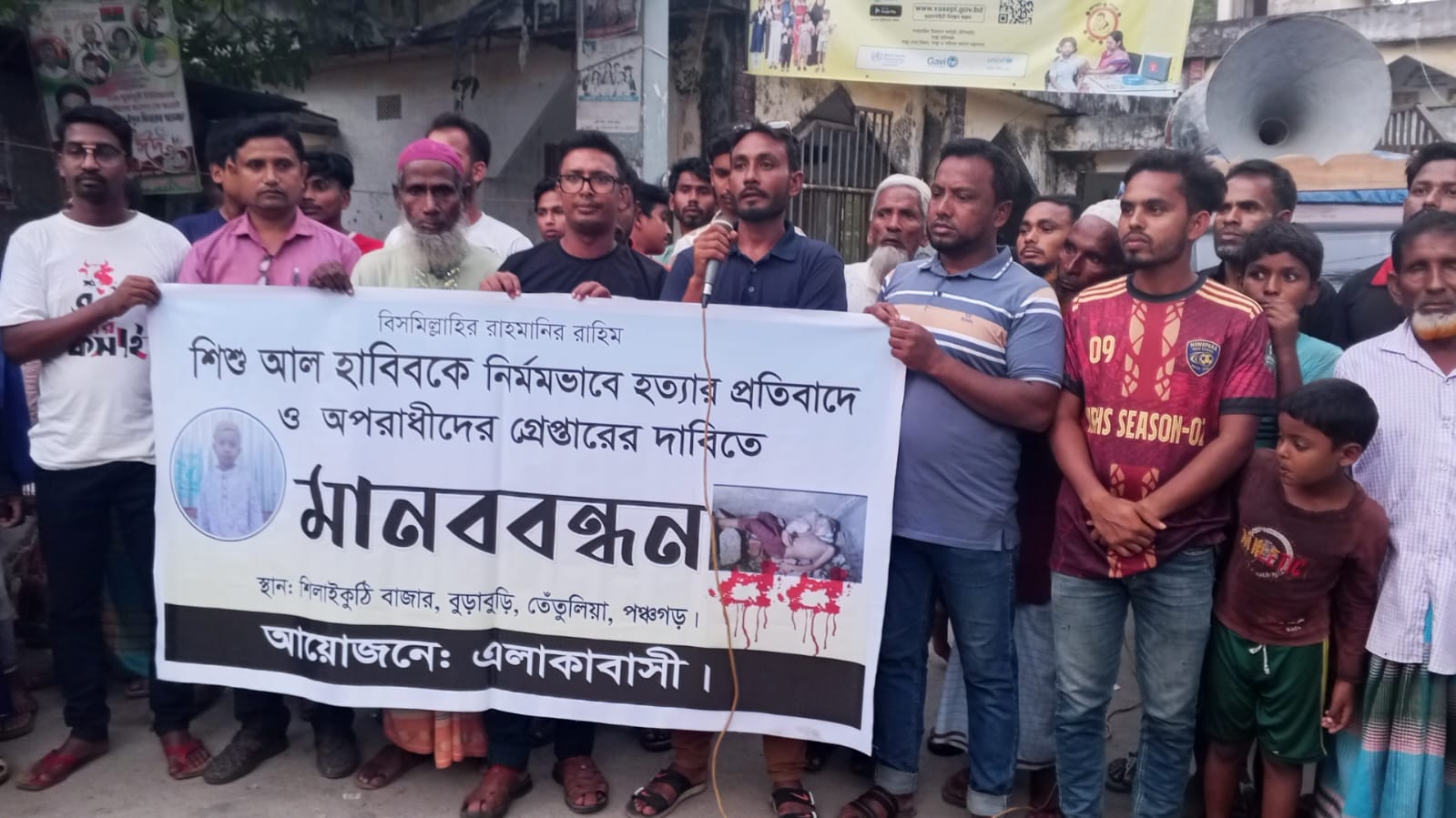 পঞ্চগড়ের তেঁতুলিয়ায় ছয় বছর বয়সী আল-হাবিব হত্যার প্রতিবাদ ও দোষীদের দ্রুত গ্রেপ্তার ও দৃষ্টান্তমূলক শাস্তি দাবি করে আজ (১৩ অক্টোবর) বিকেলে শিলাইকুঠি বাজারে একটি মানববন্ধন অনুষ্ঠিত হয়। নিহত শিশুটিকে শ্বাসরোধ করে ও মাথা ও পিঠে আঘাত করে বুড়াবুড়ি ইউনিয়নের পরিত্যক্ত ইউনিয়ন পরিষদের বাথরুমে ফেলে রাখার ঘটনায় স্থানীয়রা গভীর হলকায়।