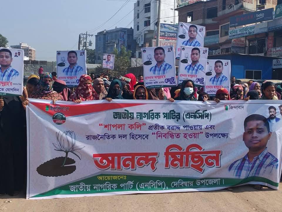 নির্বাচন কমিশনের নিবন্ধন লাভ ও নির্বাচনী প্রতীক হিসেবে ‘শাপলা কলি’ পাওয়ায় জাতীয় নাগরিক পার্টি (এনসিপি)-এর দক্ষিণাঞ্চলীয় মুখ্য সংগঠক হাসনাত আব্দুল্লাহর নিজ এলাকা কুমিল্লার দেবিদ্বারে বর্ণাঢ্য আনন্দ শোভাযাত্রা করেছে দলটির স্থানীয় নেতাকর্মীরা ।