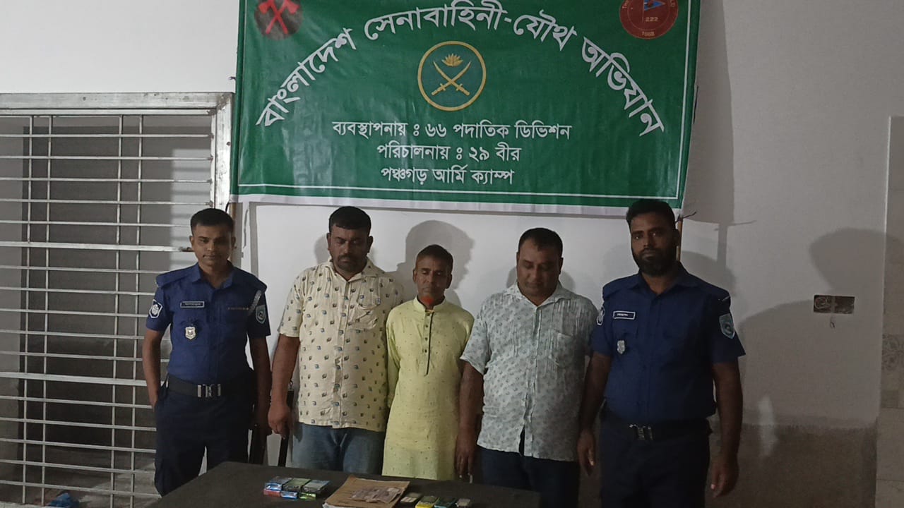 অভিযানে আটক হন— গোলাম মোস্তফার ছেলে মনির হোসেন (৫৪), মাহবুব আলমের ছেলে রুবেল (৪৯) এবং আব্দুল মজিদের ছেলে মাসুদ রানা (৪৫)। তারা সবাই পঞ্চগড় পৌরসভার বাসিন্দা। ঘটনাস্থল থেকে জব্দ করা হয় ৬,৫২০ টাকা নগদ, ছয় সেট তাসের কার্ড এবং তিনটি মোবাইল ফোন।