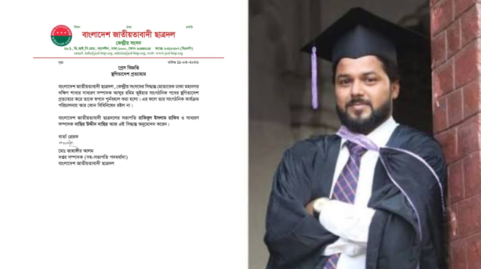 • বাংলাদেশ জাতীয়তাবাদী ছাত্রদলের সিদ্ধান্ত স্থগিতাদেশ প্রত্যাহার, পদে পুনর্বহাল