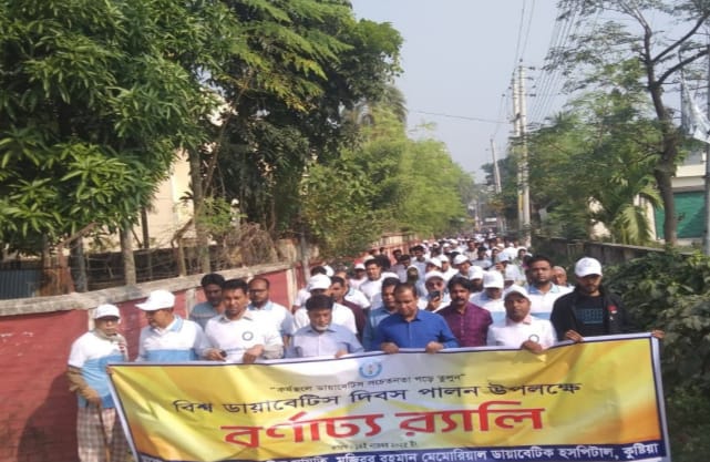বিশ্ব ডায়াবেটিস দিবসে কুষ্টিয়ায় বর্ণাঢ্য র্যালি ও আলোচনা সভা অনুষ্ঠিত হয়েছে। শুক্রবার (১৪ নভেম্বর) সকাল সাড়ে নয়টায় কুষ্টিয়া ডায়াবেটিক সমিতির আয়োজনে র্যালি ও ১০টায় হাসপাতাল প্রাঙ্গণে আলোচনা সভার আয়োজন করা হয়েছে।