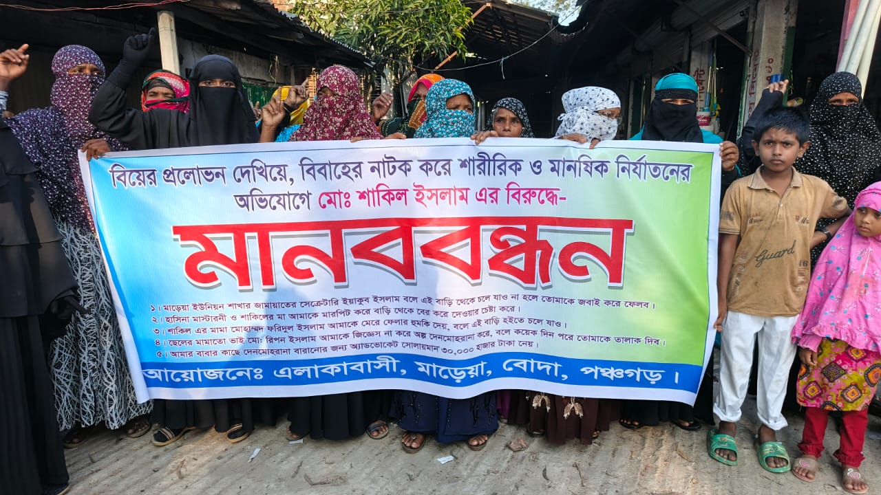 বিয়ের নাটক করে ভূয়া বিয়ের মাধ্যমে এক মাদ্রাসা ছাত্রীকে শারীরিক ও মানসিক নির্যাতনের প্রতিবাদে মানববন্ধন ও বিক্ষোভ করেছে এলাকাবাসী। মঙ্গলবার সন্ধ্যায় পঞ্চগড়ের বোদা উপজেলার মাড়েয়া বাজারে মাড়েয়া এলাকাবাসীর ব্যানারে এ মানববন্ধন অনুষ্ঠিত হয়।