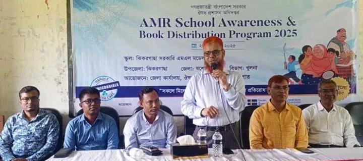যশোরের ঝিকরগাছায় সকলেই মিলে এন্টিমাইক্রোবিয়াল রেজিস্ট্যান্স প্রতিরোধ করি এই স্লোগানকে সামনে রেখে যশোর জেলা ঔষধ প্রশাসন অধিদপ্তরের উদ্যোগে ঝিকরগাছা সরকারি এম.এল. মডেল হাই স্কুলে এন্টিমাইক্রোবিয়াল রেজিস্ট্যান্স (এএমআর) স্কুল সচেতনতা ও বই বিতরণ কর্মসূচি–২০২৫ অনুষ্ঠিত হয়েছে।