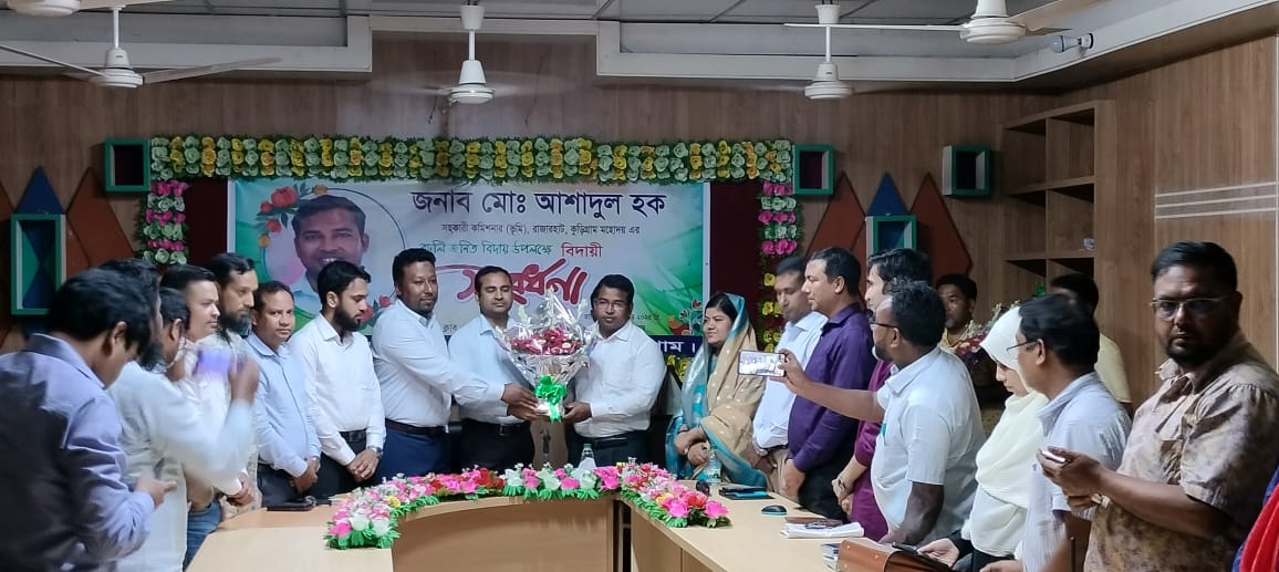বিদায়ী মো: আশাদুল হক- তিনি তার কর্মদক্ষতার হিসেবে রেখে যাচ্ছেন একটি অনুকরণীয় কর্মদপ্তর। রাজারহাটে তার সময়ে ভূমি সেবা প্রাপ্তিতে জনসাধারণের মধ্যে তৈরি হয়েছে ইতিবাচক ধারণা। তার সৌহার্দ্যপূর্ণ ব্যক্তিত্ব ও পেশাদারিত্ব প্রশাসনের সকল স্তরেরসহকর্মীদের গভীর ছাপ রেখে গেছে। অনুষ্ঠানের শেষ পর্যায়ে তার প্রতি শ্রদ্ধা ও ভালোবাসা জানিয়ে সম্মাননা ক্রেস্ট প্রদান করা হয়। নতুন কর্মস্থলে তার দীর্ঘ ও সফল কর্মজীবন কামনা করে অনুষ্ঠানের সমাপ্তি ঘটে।
