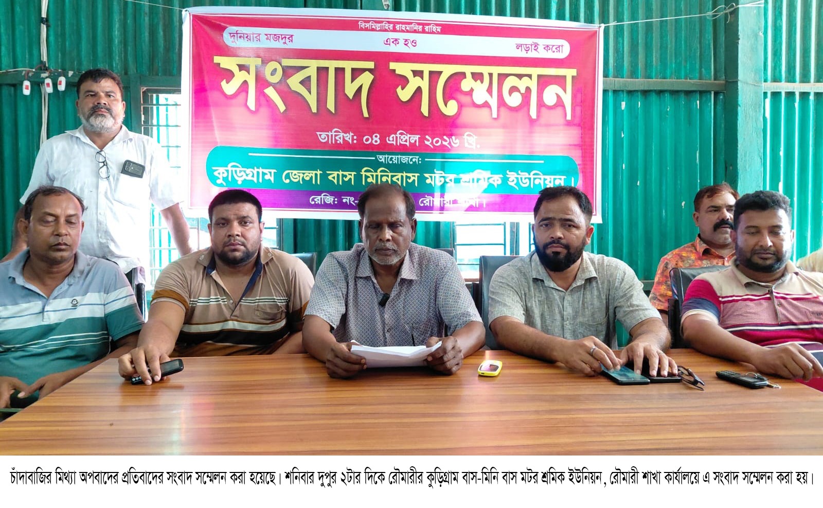 সংবাদ সম্মেলনে লিখত বক্তব্য পাঠ করেন কার্যকরী সভাপতি জিন্নাত আলী। তিনি জানান, শুক্রবার (৩ এপ্রিল) আনুমানিক রাত ৯টার দিকে একটি তুচ্ছ ঘটনাকে কেন্দ্র করে কুড়িগ্রাম জেলা বাস-মিনিবাস মটর শ্রমিক ইউনিয়ন রৌমারী উপজেলা শাখাকে’ চাঁদাবাজির মিথ্যা অপবাদ দিয়ে শাওন পরিহনের মালিক আব্দুল মতিন ও তার সঙ্গে থাকা লোকজন নিয়ে ঘৃর্ণ অপচেষ্টা চালিয়েছেন।