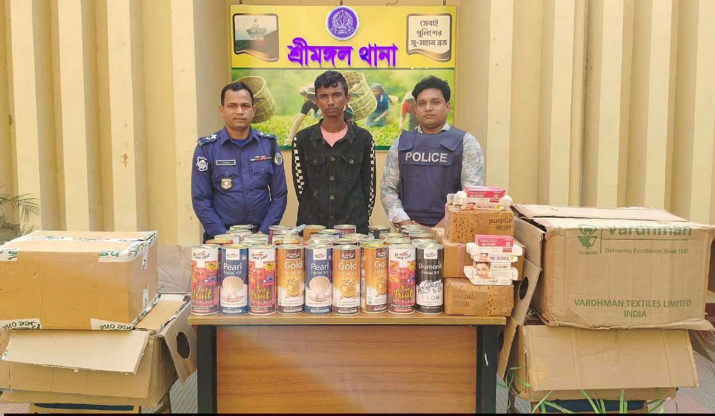 মৌলভীবাজার জেলার শ্রীমঙ্গল থানা পুলিশের অভিযানে সাব ইন্সপেক্টর সজীব চৌধুরী এর নেতৃত্বে পুলিশের একটি অভিযানিক টিম গোপন সংবাদের ভিত্তিতে ইং ২০/০১/২০২৬ তারিখ ভোর রাত ০৩.৩০ ঘটিকায় শ্রীমঙ্গল ধানাধীন ৮ নং কালীঘাট ইউনিয়নের কালীঘাট চা বাগানের সাব পোস্ট অফিসের সামনে শ্রীমঙ্গল টু হরিণছড়া গামী পাকা রাস্তার উপর গাড়ী চেকপোস্ট করেন। চেকপোস্ট করাকালে সন্দহ ভাজন ১টি সিএনজি অটোরিক্সা থামান। পুলিশ দেখে সিএনজি হতে পালানোর সময় শিপন মিয়া (২০), পিতাঃ শাহিন আলম, মাতাঃ রত্না বেগম, সাং কুঞ্জবন, ৪ নং সুন্দরখান ইউপি, থানাঃ শ্রীমঙ্গল, জেলাঃ মৌলভীবাজারকে আটক করা হয়। উক্ত সিএনজি তল্লাশী করে ৪ টি বড় কার্টন পাওয়া যায়। ৩ টি কার্টুনের ভিতর ভারতীয় Natural Bee one কোম্পানির Pearl Facial Kit ১২ টি, Grape Wine Facial Kit ৩ টি, Diamond Facial Kit ১২ টি, Five Fruit Facial Kit ১২ টি, Gold Facial Kit ১২ টি সর্বমোট ৫১ টি, অনুমান মূল্য (৫১ x৩০০০) # ১,৫৩,০০০/ – টাকা, অপর একটি কার্টনে No scars Cream ৬৩০ পিচ, মূল্য অনুমান (৬৩০x ৩০০)= ১৮৯,০০০/- টাকা। আটক ব্যক্তি উক্ত মালামালের বিষয়ে বৈধ কোন কোন কাগজ পত্র দেখাতে পারে নাই। একটি সিএনজি মূল্য ৩,৫০,০০০/ – টাকা সহ উপরোক্ত মালামাল জব্দ তালিকা মূলে জব্দ করা হয়। আটককৃত মালামালের মোট মূল্য অনুমান ৬,৯২,০০০/- (ছয় লক্ষ বিরানব্বই হাজার) টাকা। উক্ত বিষয়ে শ্রীমঙ্গল থানায়
