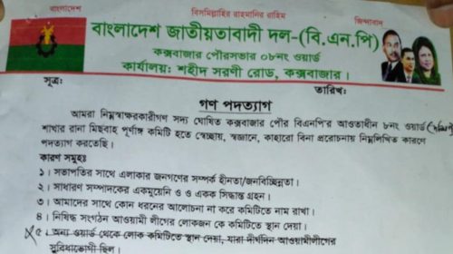 বাংলাদেশ জাতীয়তাবাদী দল(বিএনপি)র থেকে ১০ নেতার পদত্যাগ