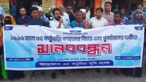রাঙামাটিতে ৩৫ কাঠুরিয়া গণহত্যার বিচার ও পূর্ণবাসনের দাবিতে মানববন্ধন