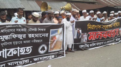 জামালপুর সদরে বেলটিয়া নিরাপদ সড়কের দাবিতে মানববন্ধন