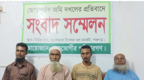 পঞ্চগড়ে জোরপুর্বক জমি দখলের প্রতিবাদে সংবাদ সম্মেলন করেছে ভুক্তভোগীরা।